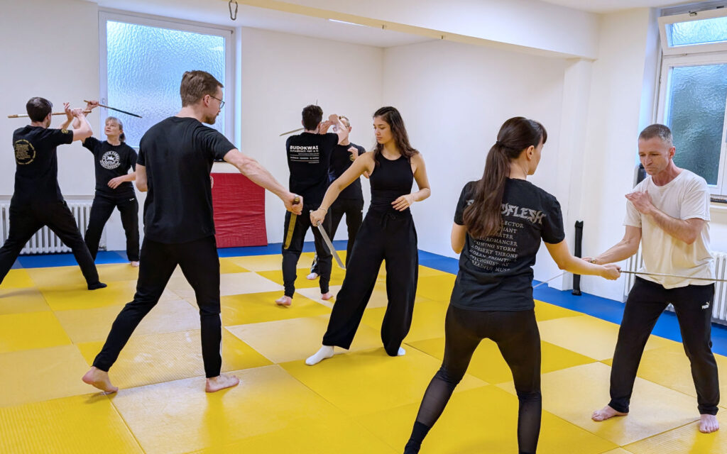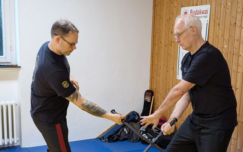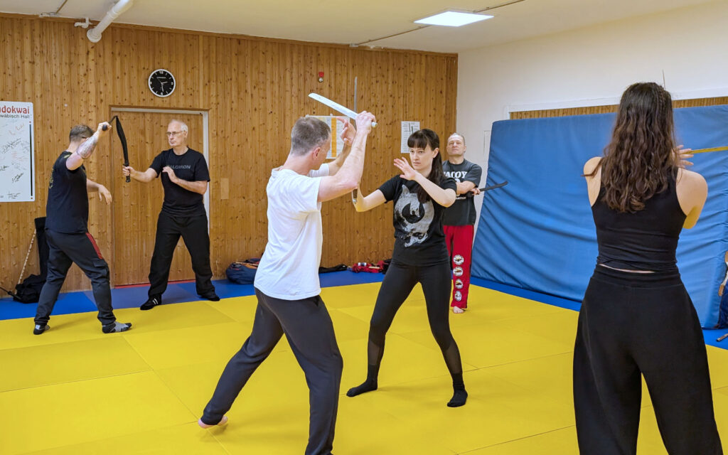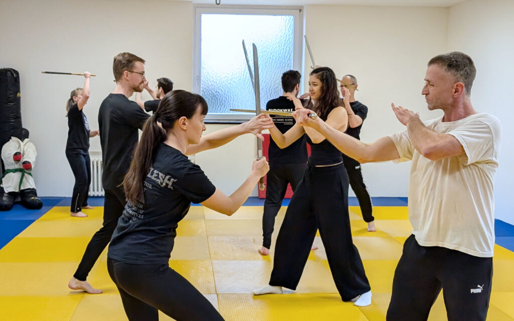 Neben der Messerabwehr standen traditionelle Schwerttechniken auf dem Programm. Mit Trainingsschwertern wurden Schlagmuster, Blockvariationen und fließende Kombinationen geübt. Dabei zeigte sich eindrucksvoll, wie eng Koordination, Körpermechanik und Präzision miteinander verbunden sind. Fortgeschrittene Teilnehmer konnten ihre Technik verfeinern, während Einsteiger systematisch an die Grundprinzipien herangeführt wurden.
